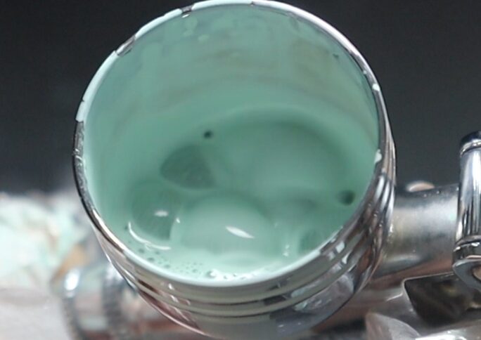 溶剤を含みすぎると塗料に「粘度」が足りず、エアブラシから塗料と一緒に出てくる空気に負けてしまい、塗料が垂れてしまいます。